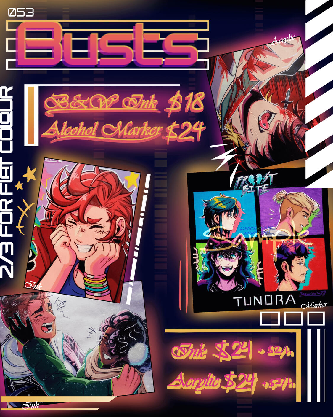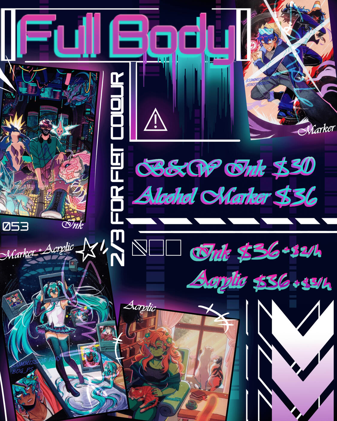I work in traditional, but I give photos of my tradi pieces :) All prices in USD and through Ko-fi, and some of my prices are set price + per hour, but I have options for just set price too, so don't worry :D